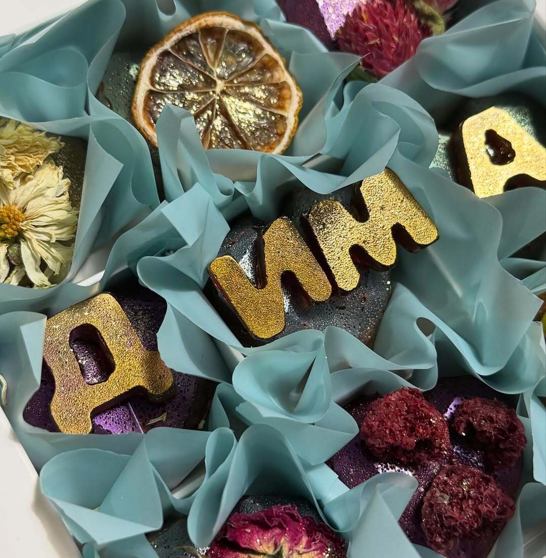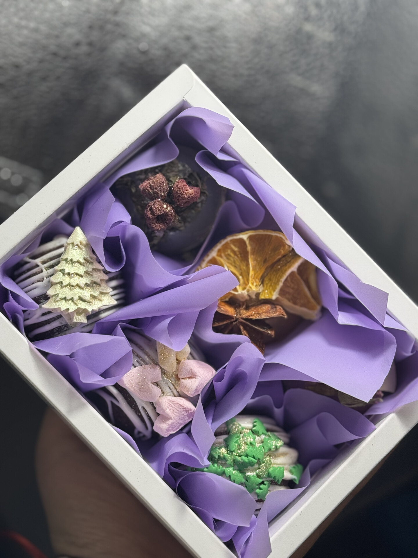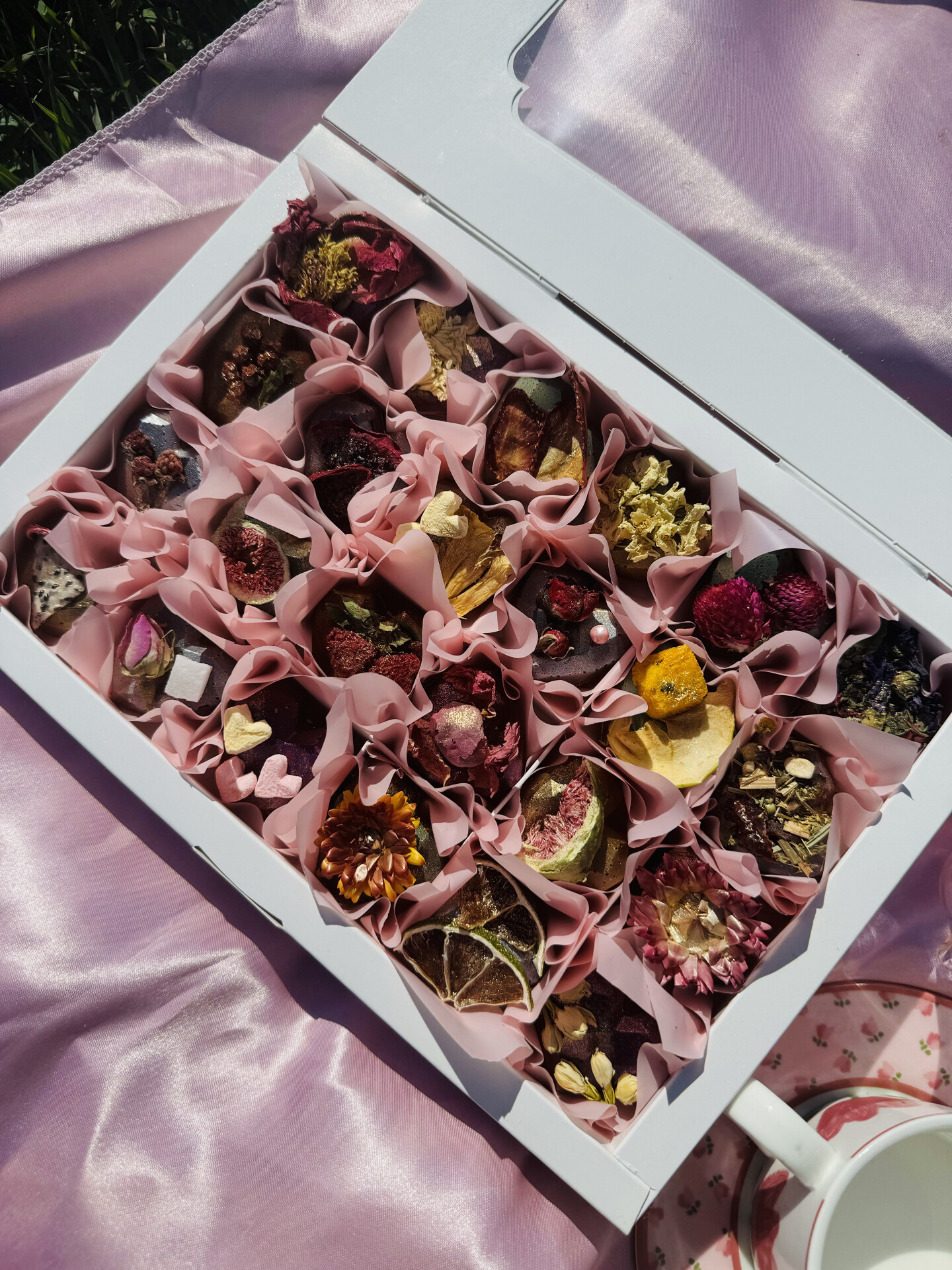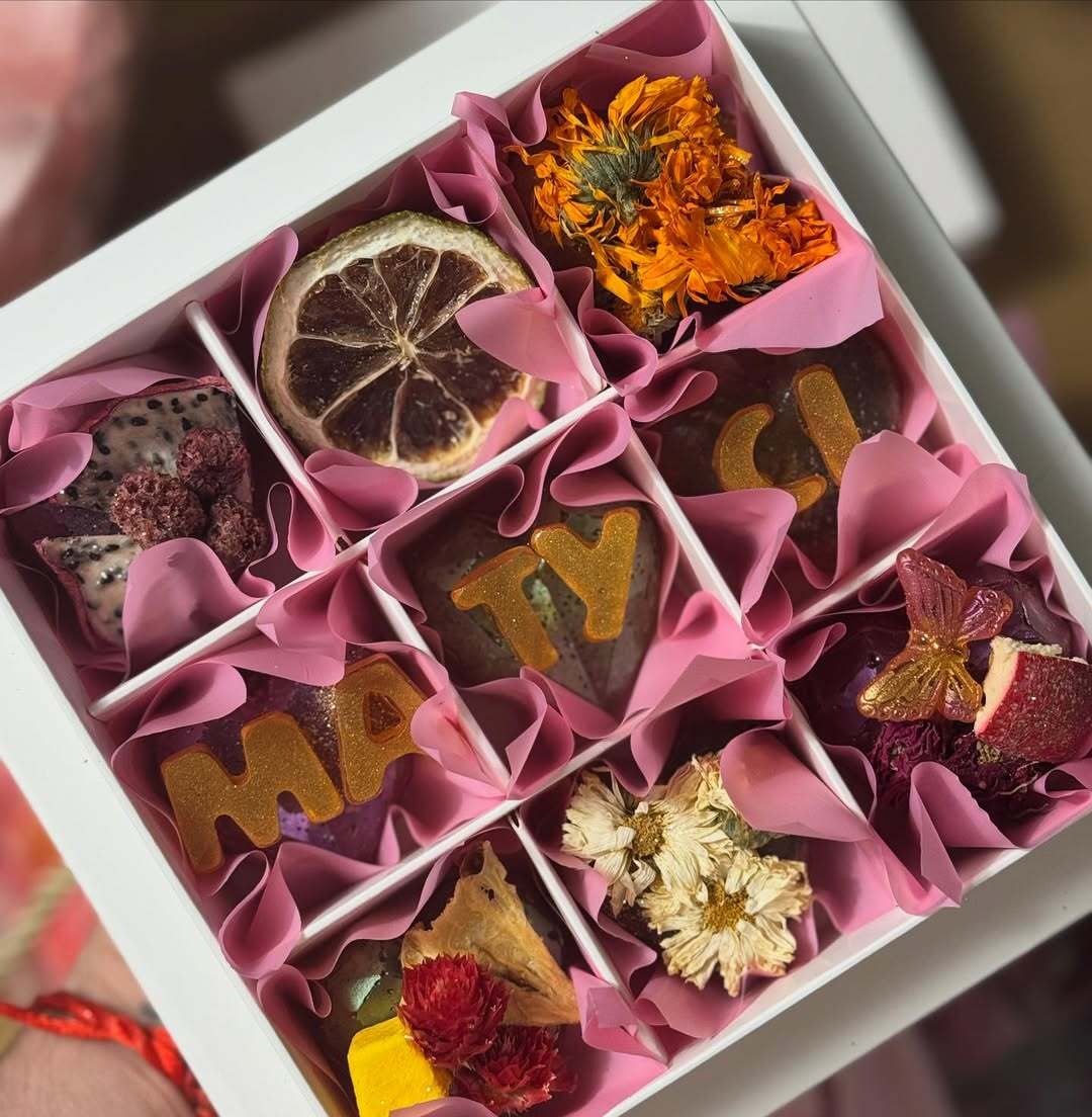 Чайно-шоколадний набір на 6 шт. В ньому знаходиться смачний шоколад всередині якого знаходиться какао та маршмелоу і смачний чайок, всередині карамельно-медової оболонки, фрукти та чайні квіти.