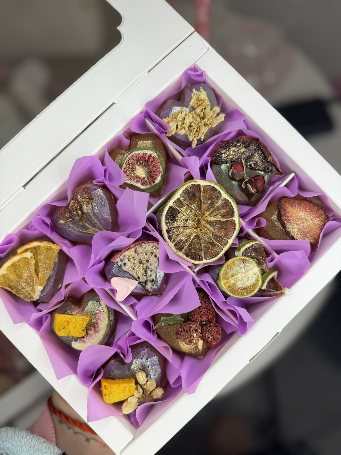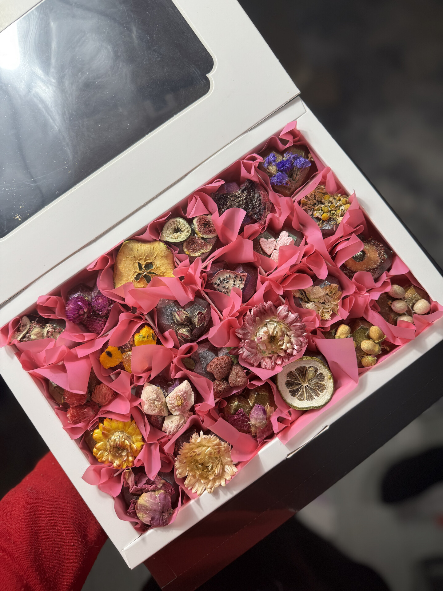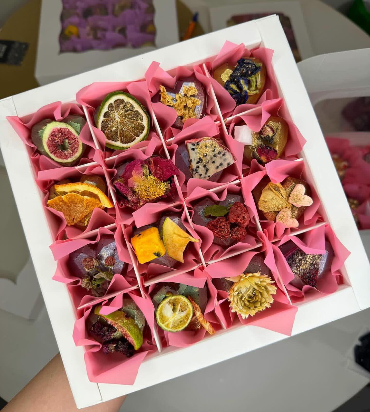Адже в ньому й смачний шоколад всередині якого знаходиться какао та маршмелоу й смачний чайок, всередині карамельно-медової оболонки й фрукти, чайні квіти.