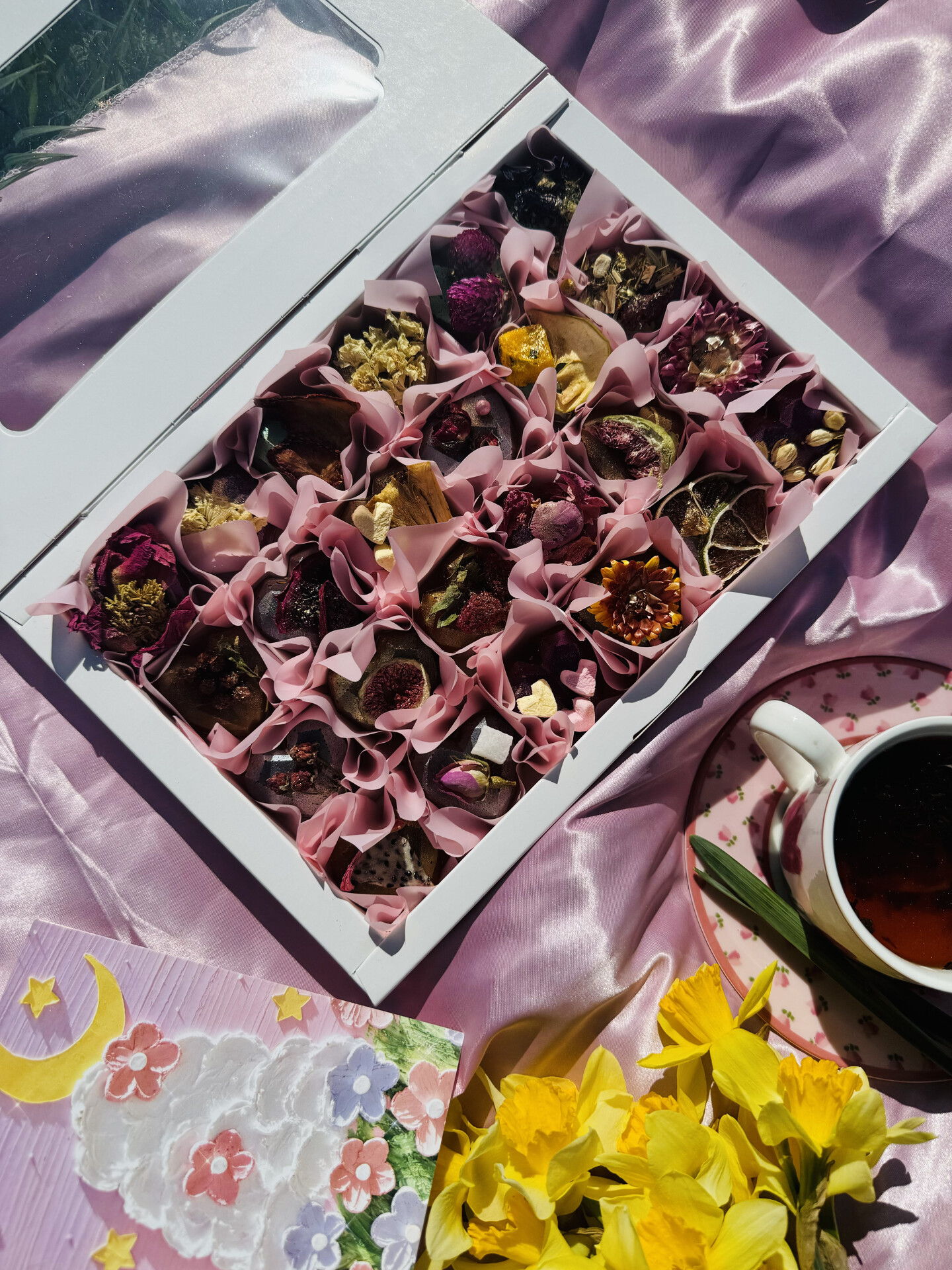 Цей унікальний набір включає 12 чайних сердечок, кожне з яких має свій індивідуальний декор та чай всередині. Прикрашені чайними фруктами та квітами, ці сердечка стануть ідеальним подарунком для ваших близьких 🎁