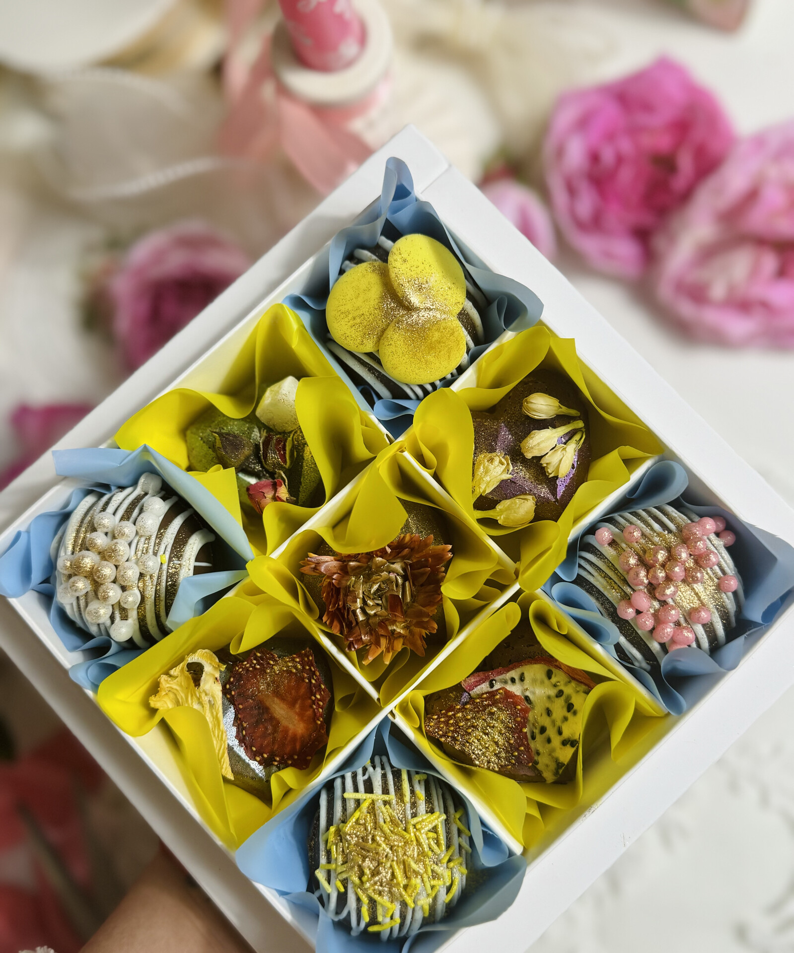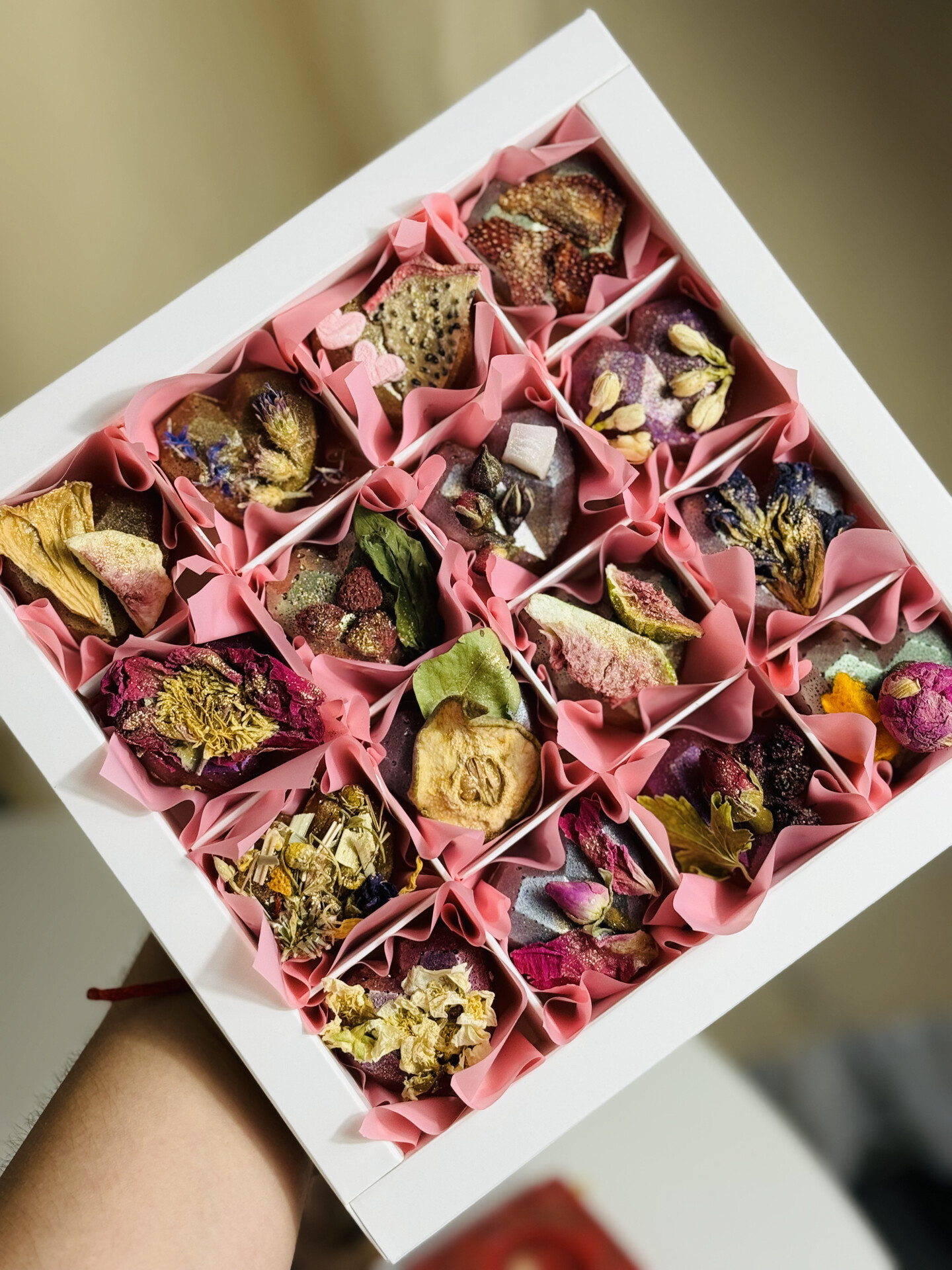 Чайно-шоколадний набір на 9 шт. В ньому знаходиться смачний шоколад всередині якого знаходиться какао та маршмелоу і смачний чайок, всередині карамельно-медової оболонки, фрукти та чайні квіти.