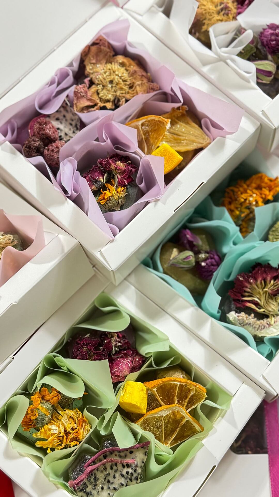 Цей унікальний набір включає 6 чайних сердечок, кожне з яких має свій індивідуальний декор та чай всередині. Прикрашені чайними фруктами та квітами, ці сердечка стануть ідеальним подарунком для ваших близьких 🎁