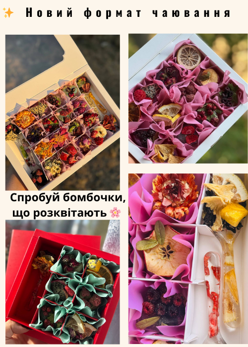 Шукаєте унікальний та елегантний подарунок? Чайні бомбочки – це не просто чай, а справжній ритуал задоволення! Достатньо опустити бомбочку в гарячу воду – і вона почне ніжно шипіти, наповнюючи чашку вишуканими ароматами та натуральними смаками.💫