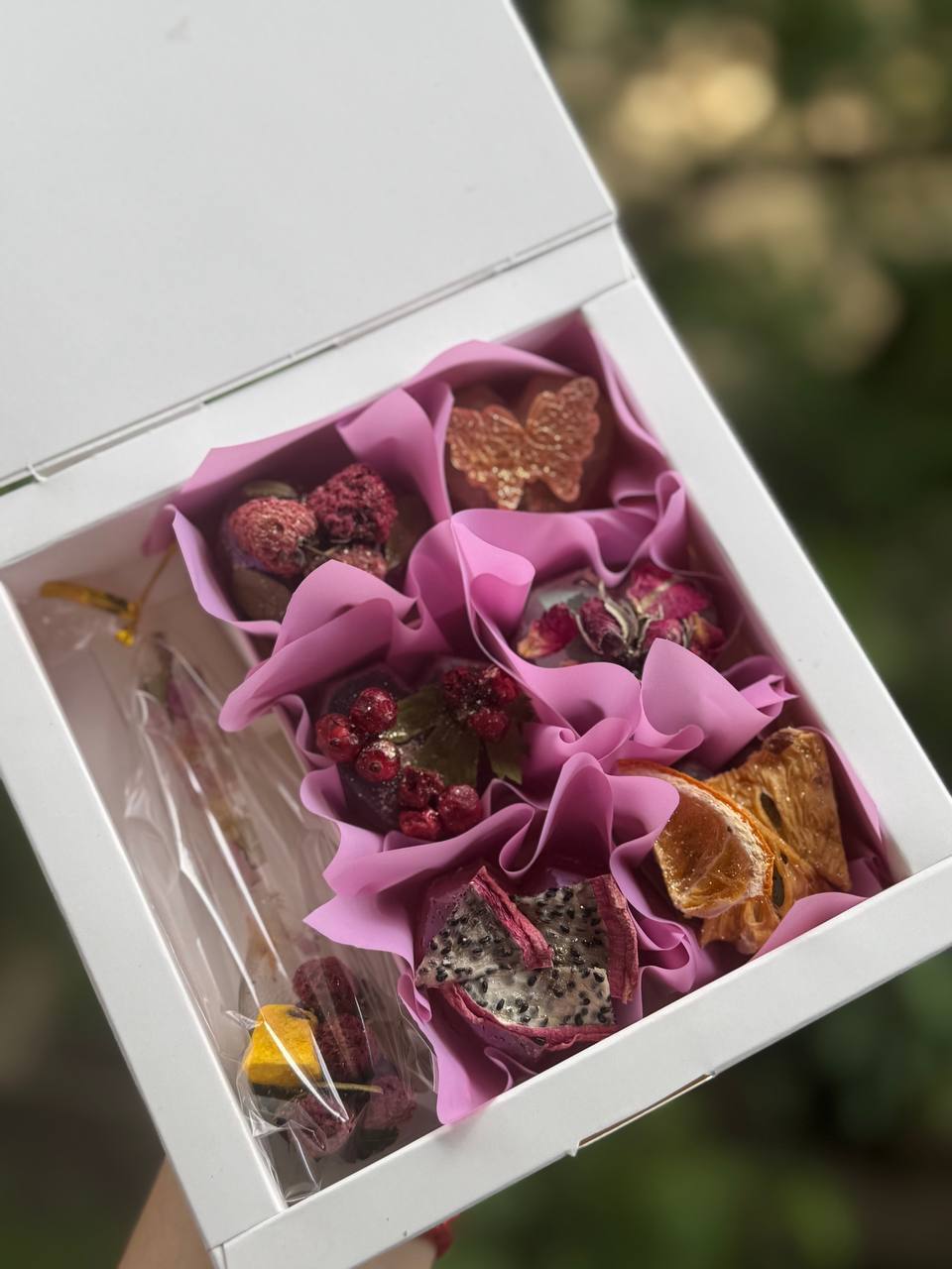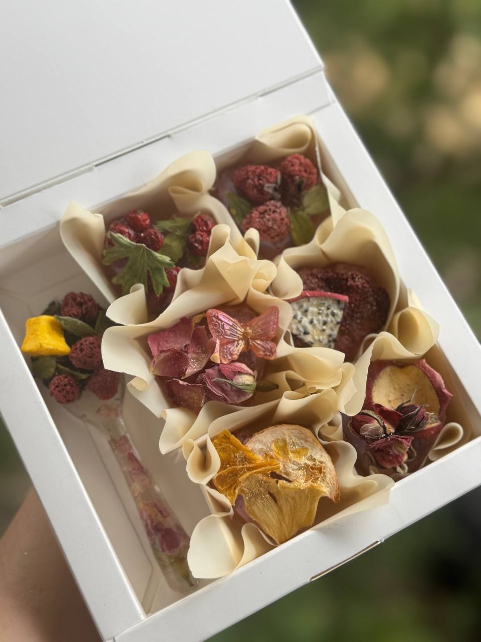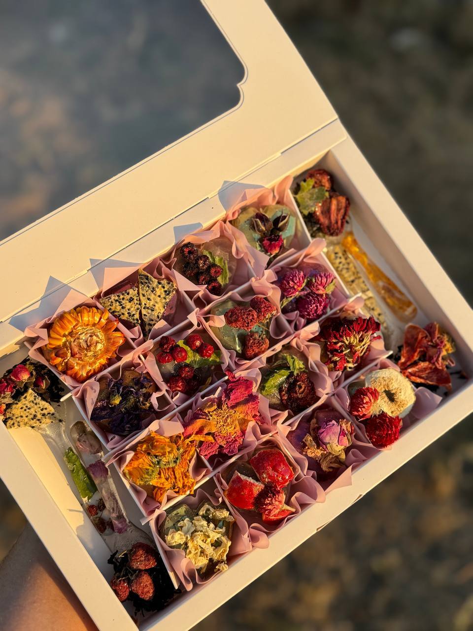 Адже в ньому й смачний шоколад всередині якого знаходиться какао та маршмелоу й смачний чайок, всередині карамельно-медової оболонки й фрукти, чайні квіти.