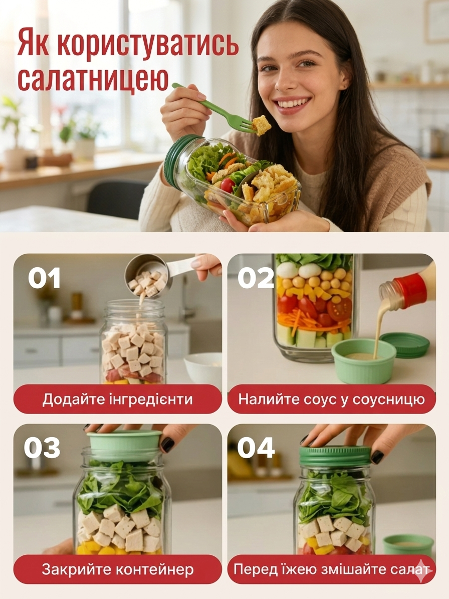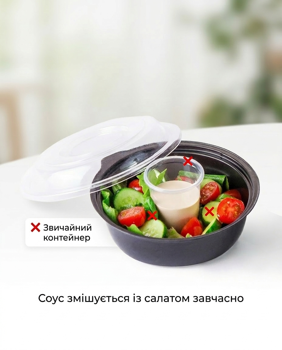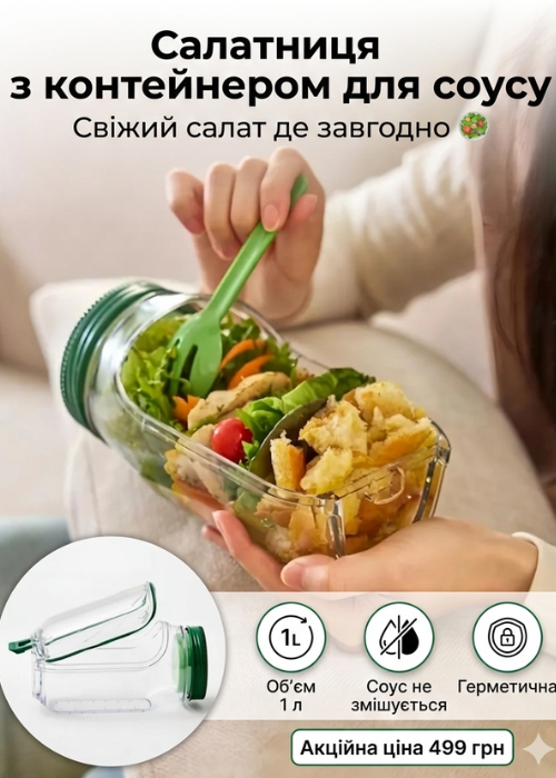 Завдяки окремому контейнеру для соусу інгредієнти не змішуються завчасно. Ви додаєте соус тільки перед вживанням, тому салат залишається свіжим і хрустким